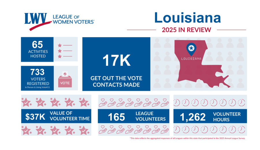 CLOSED PARTY PRIMARIES 2026 CIVIL SERVICE AMENDMENT CONTACT YOUR LEGISLATOR LEGISLATIVE SESSIONS HOW TO TRACK BILLS LITIGATION ADVOCACY LEGISLATIVE ADVOCACY REDISTRICTING 2022 2025 LEGISLATIVE BILL TRACKER CRIMINAL JUSTICE EDUCATION ENVIRONMENT HEALTHCARE LIBRARY FREEDOM TAX POLICY VOTING RIGHTS VOTER SERVICES WOMEN’S ISSUES BYLAWS POLICIES & PROCEDURES COMMUNICATIONS FUNDRAISING MEMBERSHIP NOMINATING/CBS> NEWS LOUISIANA RESOURCES LWVLA POSITIONS LWVLA STUDIES CALENDAR