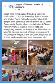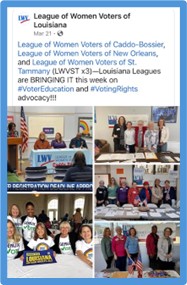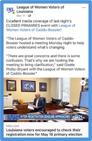 In case you missed it in the lagniappe to last month’s newsletter, LWVLA started the month of March with League president M. Christian Green giving voice to some Louisiana League views on Closed Party Primaries and the Inactive Voters Lists on KVRF Baton Rouge’s “Talk Louisiana” with Jim Engster. If you missed it, you can find it and direct others to it at the top item on our LWVLA website or click here to listen.